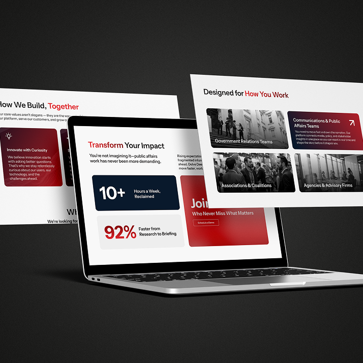 We modernized Delve’s website to clearly communicate their AI-native platform and expert-driven insights for public affairs teams. By prioritizing intuitive navigation, clean visuals, and purposeful content, the site highlights their innovation, authority, and ability to surface what matters most—making complex intelligence accessible and actionable for users.
